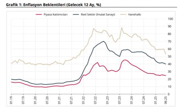 TÜRKİYE Cumhuriyet Merkez Bankası (TCMB), 12 ay sonrası yıllık enflasyon beklentilerinin piyasa katılımcıları için yüzde 24,6'ya, reel sektör için yüzde 39,8'e ve hanehalkı için yüzde 53'e gerilediğini açıkladı.TCMB, Haziran 2025 dönemine ilişkin sektörel enflasyon beklentilerini yayımladı. Buna göre; haziranda 12 ay sonrası yıllık enflasyon beklentileri, piyasa katılımcıları için 0,5 puan azalarak yüzde 24,6, reel sektör için 1,2 puan gerileyerek yüzde 39,8 ve hanehalkı için ise 6,9 puan düşerek yüzde 53 oldu. Gelecek 12 aylık dönemde enflasyonun düşeceğini bekleyen hanehalkı oranı, geçen aya göre 2,9 puan artışla yüzde 30,7 olarak gerçekleşti.