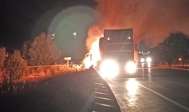 SİVAS'ta, TIR'ın saman balyası yüklü dorsesinde çıkan yangın, itfaiyenin müdahalesiyle söndürüldü.Merkeze bağlı Sorguncuk köyü yakınlarında, şoförü öğrenilemeyen 49 AKK 134 plakalı TIR'ın saman yüklü dorsesinde saat 01.00 sıralarında yangın çıktı. Kısa sürede büyüyen yangını fark eden şoför, TIR'ı yol kenarına park ederek, itfaiye ekiplerinden yardım istedi. İhbarla bölgeye itfaiye ekibi sevk edildi. Ekiplerin yaklaşık 1 saat süren çalışmasıyla yangın söndürüldü.TIR'ın dorsesinde zarar yol açan yangınla ilgili inceleme başlatıldı.