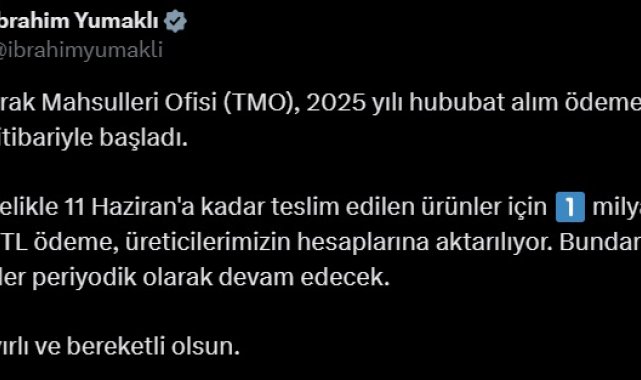 ANKARA, (DHA)- TARIM ve Orman Bakanı İbrahim Yumaklı, Toprak Mahsulleri Ofisi'nin (TMO), hububat alım bedellerini bugün itibarıyla üreticilerin hesaplarına aktarmaya başladığını duyurdu