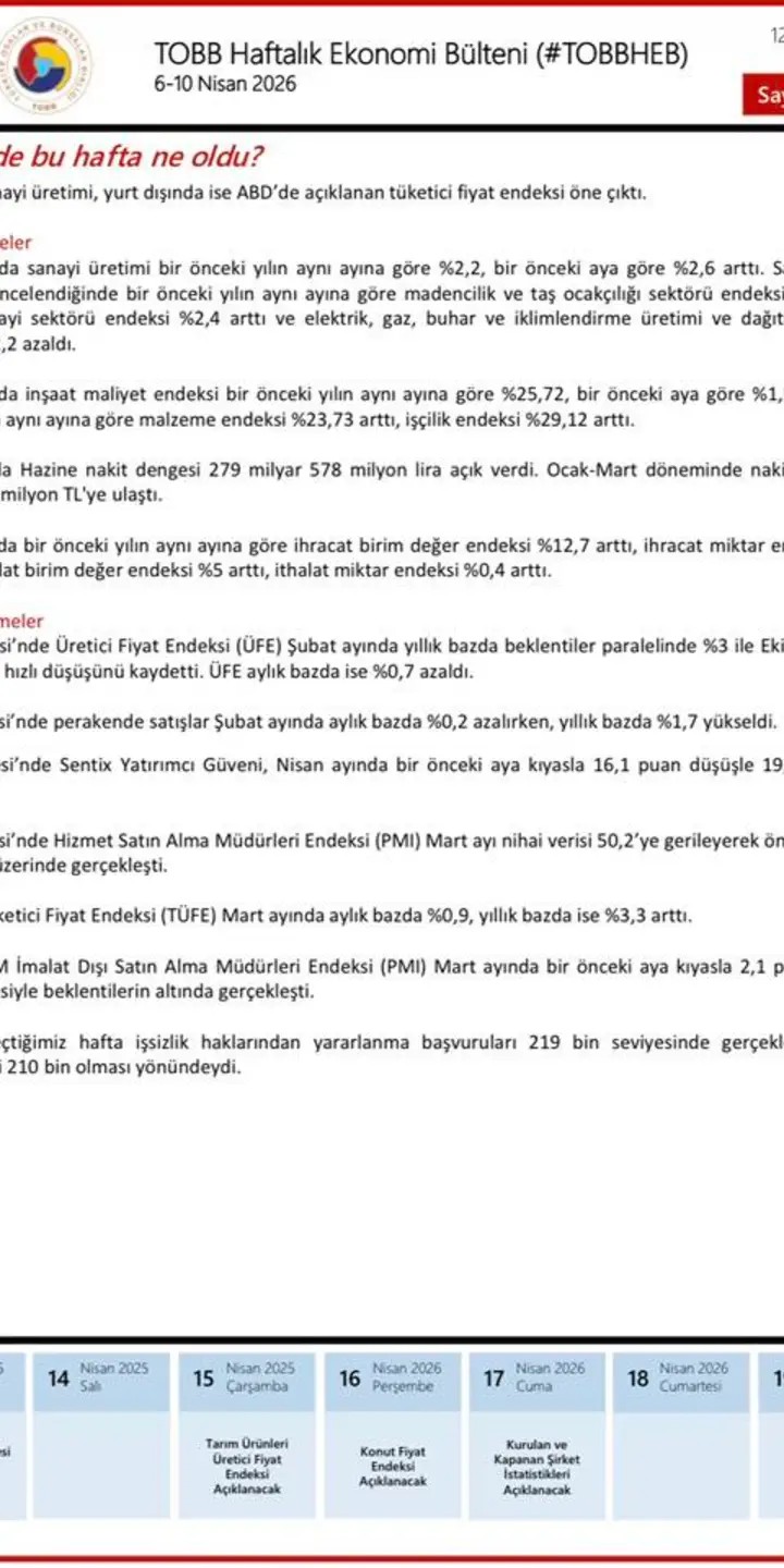 Türkiye Odalar ve Borsalar Birliği (TOBB) tarafından hazırlanan Haftalık Ekonomi Bülteni, 6-10 Nisan tarihleri arasında Türkiye ve dünya ekonomisinde meydana gelen güncel gelişmeleri derliyor. Bülten, ilgili tarihler arasındaki ekonomik verileri ve analizleri içeriyor.Bültene, TOBB'un resmi internet sitesi üzerinden de erişim sağlanabiliyor. Okuyucular, detaylı bilgilere https://www.tobb.org.tr/ekonomibulteni adresinden ulaşabilirler.Editör: Haber Merkezi