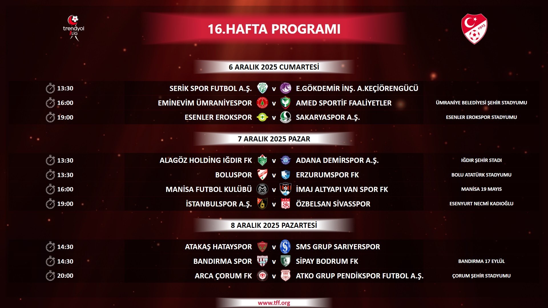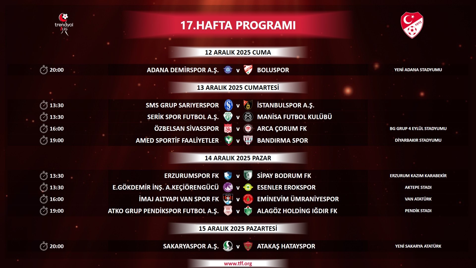 Fikstürde saha bilgisi boş bırakılan müsabakaların hangi stadyumlarda oynanacağına dair bilgiler ise daha sonra TFF tarafından ilan edilecek.Editör: Haber MerkeziKaynak: Sosyal Medya