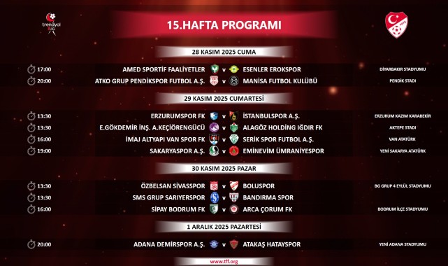 Türkiye Futbol Federasyonu (TFF), Trendyol 1. Lig'in 15, 16 ve 17. hafta müsabakalarına ait fikstürü duyurdu.Yapılan açıklamaya göre, 28 Kasım Cuma günü saat 17:00'de oynanacak Amed Sportif Faaliyetler - Esenler Erokspor maçıyla 15. hafta başlayacak. Hafta boyunca devam edecek mücadeleler, 1 Aralık Pazartesi günü saat 20:00'de oynanacak Adana Demirspor A.Ş. - Atakaş Hatayspor maçıyla tamamlanacak.Saha Bilgisi Olmayan Maçlar Sonra Belirlenecek