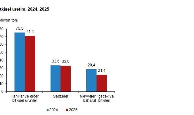 TÜRKİYE İstatistik Kurumu (TÜİK), 2025 yılı bitkisel üretiminde, bir önceki yıla göre tahıllar ve diğer bitkisel ürünlerde yüzde 5,3, sebzelerde yüzde 1,7, meyveler, içecek ve baharat bitkilerinde yüzde 24,4 oranında azalış öngörüldüğünü açıkladı.