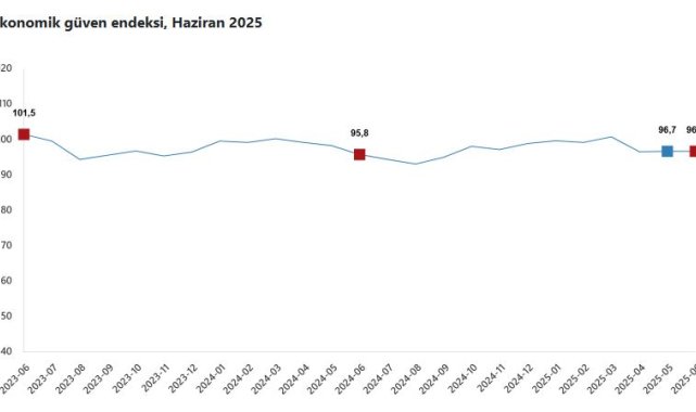 TÜİK, Haziran 2025 dönemine ilişkin ekonomik güven endeksi verilerini açıkladı. Buna göre; ekonomik güven endeksi haziran ayında bir önceki aya göre yüzde 0,1 oranında artarak 96,71 değerini aldı. Bir önceki aya göre haziran ayında tüketici güven endeksi yüzde 0,3 oranında artarak 85,1 değerini, reel kesim (imalat sanayi) güven endeksi yüzde 0,2 oranında azalarak 98,4 değerini, hizmet sektörü güven endeksi yüzde 0,4 oranında artarak 110,9 değerini, perakende ticaret sektörü güven endeksi yüzde 2,5 oranında azalarak 108,5 değerini, inşaat sektörü güven endeksi yüzde 1,7 oranında azalarak 86,9 değerini aldı.