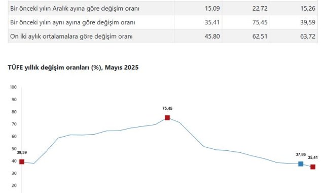 TÜRKİYE İstatistik Kurumu (TÜİK), mayıs ayına ilişkin enflasyon verilerini açıkladı. Tüketici enflasyonu yıllık yüzde 35,41, aylık yüzde 1,53 oldu.TÜİK, Mayıs 2025 dönemine ilişkin tüketici fiyat endeksi verilerini açıkladı. Buna göre; tüketici fiyatları, bir önceki aya göre yüzde 1,53, bir önceki yılın aralık ayına göre yüzde 15,09, bir önceki yılın aynı ayına göre yüzde 35,41 ve 12 aylık ortalamalara göre yüzde 45,80 arttı.En yüksek ağırlığa sahip 3 ana harcama grubunun yıllık değişimleri; gıda ve alkolsüz içeceklerde yüzde 32,87 artış, ulaştırmada yüzde 24,59 artış ve konutta yüzde 67,43 artış olarak gerçekleşti. İlgili ana grupların yıllık değişime olan etkileri ise gıda ve alkolsüz içeceklerde yüzde 8,25, ulaştırmada yüzde 4,07 ve konutta yüzde 9,34 oldu. En yüksek ağırlığa sahip 3 ana harcama grubunun aylık değişimleri; gıda ve alkolsüz içeceklerde yüzde 0,71 azalış, ulaştırmada yüzde yüzde 2,66 artış ve konutta yüzde 2,99 artış olarak gerçekleşti. İlgili ana grupların aylık değişime olan etkileri ise gıda ve alkolsüz içeceklerde yüzde eksi 0,18, ulaştırmada yüzde 0,40 ve konutta yüzde 0,48 oldu.Endekste kapsanan 143 temel başlıktan 28 temel başlığın endeksinde düşüş gerçekleşirken, 4 temel başlığın endeksinde değişim olmadı. 111 temel başlığın endeksinde ise artış gerçekleşti.Yurt içi üretici fiyatları da mayıs ayında bir önceki aya göre yüzde 2,48, bir önceki yılın aralık ayına göre yüzde 12,92, bir önceki yılın aynı ayına göre yüzde 23,13 ve 12 aylık ortalamalara göre yüzde 30,17 arttı.