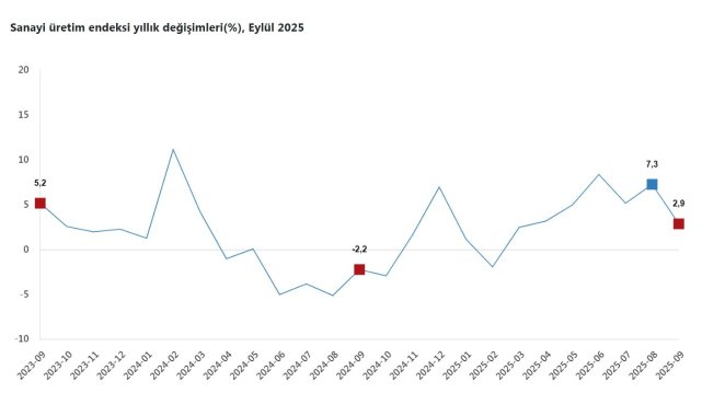 TÜRKİYE İstatistik Kurumu (TÜİK), eylül ayında sanayi üretiminin yıllık yüzde 2,9 arttığını; aylık yüzde 2,2 azaldığını açıkladı.TÜİK, Eylül 2025 dönemine ilişkin sanayi üretim endeksi verilerini açıkladı. Buna göre; sanayi üretimi bir önceki yılın aynı ayına göre yüzde 2,9 arttı. Sanayinin alt sektörleri incelendiğinde, madencilik ve taş ocakçılığı sektörü endeksi bir önceki yılın aynı ayına göre yüzde 3,1 arttı, imalat sanayi sektörü endeksi yüzde 2,7 arttı ve elektrik, gaz, buhar ve iklimlendirme üretimi ve dağıtımı sektörü endeksi yüzde 5,3 arttı.Sanayi üretimi, bir önceki aya göre de yüzde 2,2 azaldı. Sanayinin alt sektörleri incelendiğinde, madencilik ve taş ocakçılığı sektörü endeksi bir önceki aya göre yüzde 1,2 arttı, imalat sanayi sektörü endeksi yüzde 2,3 azaldı ve elektrik, gaz, buhar ve iklimlendirme üretimi ve dağıtımı sektörü endeksi yüzde 2,4 azaldı.