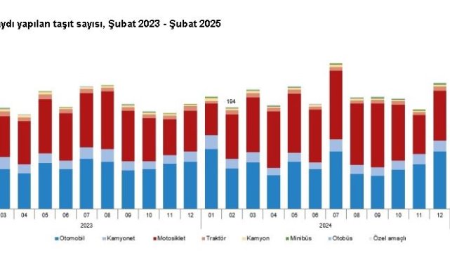 Ocak-Şubat 2025 döneminde bir önceki yılın aynı dönemine göre trafiğe kaydı yapılan taşıt sayısı yüzde 25,7 azalarak 302 bin 544 olurken, trafikten kaydı silinen taşıt sayısı da yüzde 56,1 artarak 7 bin 108 adet oldu. Böylece ocak-şubat döneminde trafikteki toplam taşıt sayısında 295 bin 436 artış gerçekleşti.