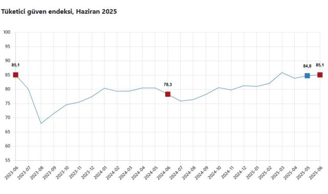 TÜRKİYE İstatistik Kurumu (TÜİK), haziran ayında tüketici güven endeksinin bir önceki aya göre yüzde 0,3 oranında artarak 85,1 olduğunu açıkladı.TÜİK, Haziran 2025 dönemine ilişkin tüketici güven endeksi verilerini açıkladı. Buna göre; tüketici güven endeksi, bir önceki aya göre yüzde 0,3 oranında artarak 85,1 oldu. Mevcut dönemde hanenin maddi durumu endeksi yüzde 0,4 artışla 69,3 oldu. Gelecek 12 aylık dönemde hanenin maddi durum beklentisi endeksi yüzde 0,6 artışla 85,8, gelecek 12 aylık dönemde genel ekonomik durum beklentisi endeksi yüzde 0,3 artışla 82,4, gelecek 12 aylık dönemde dayanıklı tüketim mallarına harcama yapma düşüncesi endeksi yüzde 0,1 artışla 102,6 değerini aldı.