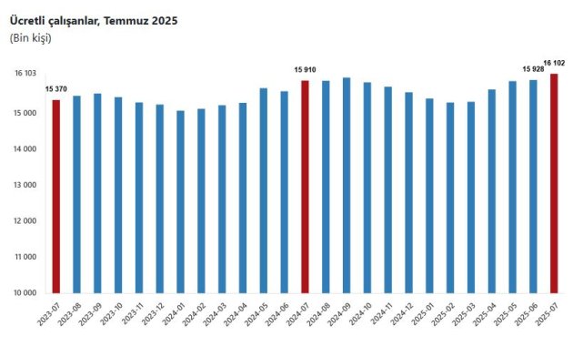 TÜİK, Temmuz 2025 dönemine ilişkin ücretli çalışan istatistiklerini açıkladı. Buna göre; sanayi, inşaat ve ticaret-hizmet sektörleri toplamında ücretli çalışan sayısı 2025 Temmuz ayında bir önceki yılın aynı ayına göre yüzde 1,2 arttı. Ücretli çalışan sayısı bir önceki yılın aynı ayında 15 milyon 910 bin 286 kişi iken, 2025 yılı Temmuz ayında 16 milyon 101 bin 724 kişi oldu. Ücretli çalışanların alt detaylarına bakıldığında; 2025 Temmuz ayında ücretli çalışan sayısı yıllık olarak sanayi sektöründe yüzde 3,5 azaldı, inşaat sektöründe yüzde 7,7 arttı ve ticaret-hizmet sektöründe yüzde 2,5 arttı.