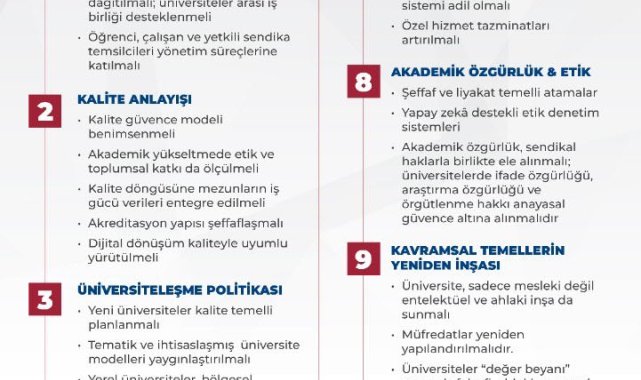 EĞİTİM-Bir-Sen ve İbn Haldun Üniversitesi iş birliğiyle Ankara'da düzenlenen 'Türkiye'de Yükseköğretimin Yeniden Yapılandırılması: Yenilikler, Sorunlar ve Çözüm Önerileri Uluslararası Kongresi'nin ardından 78 akademisyenin katkısıyla hazırlanan 11 maddelik reform çağrısının yer aldığı sonuç bildirisi yayımlandı. Bildiride, 'Yükseköğretim kurumlarının yönetiminde yetkilerin tek bir merkezde temerküz etmesini önleyen ve yükseköğretim çalışanlarının her türlü karar mekanizmasında yer almalarını sağlayan nitelikte yeni bir yükseköğretim kanunu hayata geçirilmeli' çağrısı yapıldı.Bildiride şu ifadelere yer verildi; "YÖK'ün yapısı aşırı merkeziyetçilikten, stratejik rehberlik yapan evrensel bir kuruma doğru dönüştürülmelidir. Yükseköğretim kurumlarının yönetiminde yetkilerin tek bir merkezde temerküz etmesini önleyen ve her türden yetkinin keyfi kullanımını önleyecek mekanizmaları tesis eden, akademik yükseltme sistemini evrensel kabul gören objektif, nesnel ve ölçülebilir kriterlere bağlayan, araştırmacı ve öğretim üyesi yetiştirme sisteminin ana hatlarını yükseköğretim politikaları doğrultusunda düzenleyen, yükseköğretim çalışanlarının her türlü karar mekanizmasında yer almalarını sağlayan nitelikte yeni bir yükseköğretim kanunu hayata geçirilmelidir. Yükseköğretim kurumlarının akademik, bilimsel özerkliğini yükseköğretim kurumlarının akademik personelinin iş güvencesi, yükseköğretime giriş, planlama, koordinasyon ve denetleme mekanizmalarının merkezileştirilmesi gibi istisnaların kabulü̈ ekseninde tanıyan ve koruyan yükseköğretim yasası hayata geçirilmelidir. "Üniversite yönetim yetkileri senato, fakülte kurulları ve iç denetim birimlerine dağıtılmalıdır. Üniversite özerkliği yasal güvence altına alınmalı, siyasi veya bürokratik müdahalelere karşı korunmalıdır. Üniversiteler arası iş birliğini destekleyecek bölgesel koordinasyon yapıları kurulmalıdır. Öğrenciler, çalışanlar (akademik-idari) ve yetkili sendika temsilcisi senato ve üniversite yönetim kurulu çalışmalarına yerine ve konuya göre, karara ortak olarak ya da gözlemci olarak katılabilmelidir. Üniversitelerde gerçekleştirilecek çalıştay, kongre ve reform odaklı kurullarda yetkili sendikalar danışma kurulu üyesi olarak yer almalı, akademik sendikacılık resmi istişare mekanizmalarında temsil edilmelidir."Öğrenciler, akademisyenler, idari personel ve sendika temsilcilerinden oluşan üniversite içi diyaloğu güçlendirecek 'Katılımcı Konseyler' kurulmalıdır. İç denetim, öğrenci geri bildirimi ve danışmanlık sistemine dayalı kalite güvence modeli benimsenmelidir. Akademik yükseltmelerde sadece yayın sayısı değil, etik, toplumsal katkı, patent sayısı, ürünleri lisanslama ve öğrenci rehberliği de ölçüt olmalıdır. Mezun izleme sistemleri daha etkin çalışmalı ve kalite döngüsüne istihdam ve iş gücü verileri entegre edilmelidir."Ulusal akreditasyon kurumlarının yapısı şeffaflaşmalı ve akreditasyon ücretleri makul ölçülere çekilmelidir. Dijital dönüşüm ve kalite güvence süreçleri eşgüdüm içinde yeniden yapılandırılmalıdır. Üniversite açılımları sayısal değil kalite odaklı planlamaya dayanmalıdır. Yerel üniversiteler, bölgesel kalkınma hedeflerine hizmet edecek biçimde yapılandırılmalıdır."Tematik ve ihtisaslaşmış üniversite modeli yaygınlaştırılmalıdır. Meslek yüksekokulları, sektörle entegre halinde, illerin etkili alan yöneticileri ile ortak yönetim kurulları oluşturulmalı, mesleki beceriyi geliştirmeye yönelik nitelikli eleman yetiştirmeye odaklanmalıdır. Bölüm tekrarları azaltılmalı, kontenjan planlaması sektörel ve demografik ihtiyaçlara göre belirlenmelidir. Tezsiz yüksek lisans programlarına, akademik kaliteyi önceleyen bir anlayış benimsenmelidir. Üniversiteler arası program geçişleri ve ortak diploma programları artırılmalıdır. Öğrenci sayısı değil, öğrenci-öğretim üyesi oranı ve ders yükü temel alınarak kontenjan belirlenmelidir. Bölüm açılışı ve kontenjan artışı için akademik donanım, yetenek ve beceri beklentileri ile altyapı ve istihdam verisi analiz edilmelidir. Eğitim fakülteleri ile Milli Eğitim Akademisi arasında sağlıklı ve sürdürülebilir bir çalışma yöntemi kurulmalıdır."Teori-pratik uyumu sağlanmalı, uygulama süresi artırılmalıdır. Aday öğretmenlik süreci yapılandırılmalı ve hizmet öncesi eğitim, muhtemel öğretmen ihtiyacına göre stratejik olarak planlanmalıdır. Temel bilimlere yönelen öğrencilere burs ve istihdam garantisi verilmelidir."Üniversite-sanayi iş birlikleri stratejik düzeye taşınmalı, bölümler buna göre yeniden kurgulanmalıdır. Ar-Ge projelerinde özel sektör ve üniversite ortaklığı önceliklendirilmelidir."Uygulamalı araştırma merkezleri kurulmalı, sanayinin ihtiyaç duyduğu alanlara odaklanılmalıdır. Temel bilimlerde kamu destekli özel araştırma fonları oluşturulmalıdır. Araştırma görevlisi, öğretim görevlisi ve öğretim üyesi alımlarında şeffaflık ve liyakat ilkesine dayalı olarak merkezi izleme mekanizmaları kurulmalıdır. Üniversite bünyesindeki idari personel için kariyer planlaması netleştirilmeli, görevde yükselme ve unvan değişikliği sınavları düzenli ve objektif kriterlerle yapılmalıdır. İdari personelin yetki, sorumluluk ve liyakat esasına dayalı statü sistemine kavuşturulması sağlanmalı; bu süreçlerde yetkili sendikaların görüş ve talepleri esas alınmalıdır. Akademisyenlerin maaşları ve özlük hakları iyileştirilmeli ve performans sistemleri adil hale getirilmelidir. Yükseköğretim alanında çalışan kamu görevlilerine yönelik özel hizmet tazminatları artırılmalı, büyük şehirler